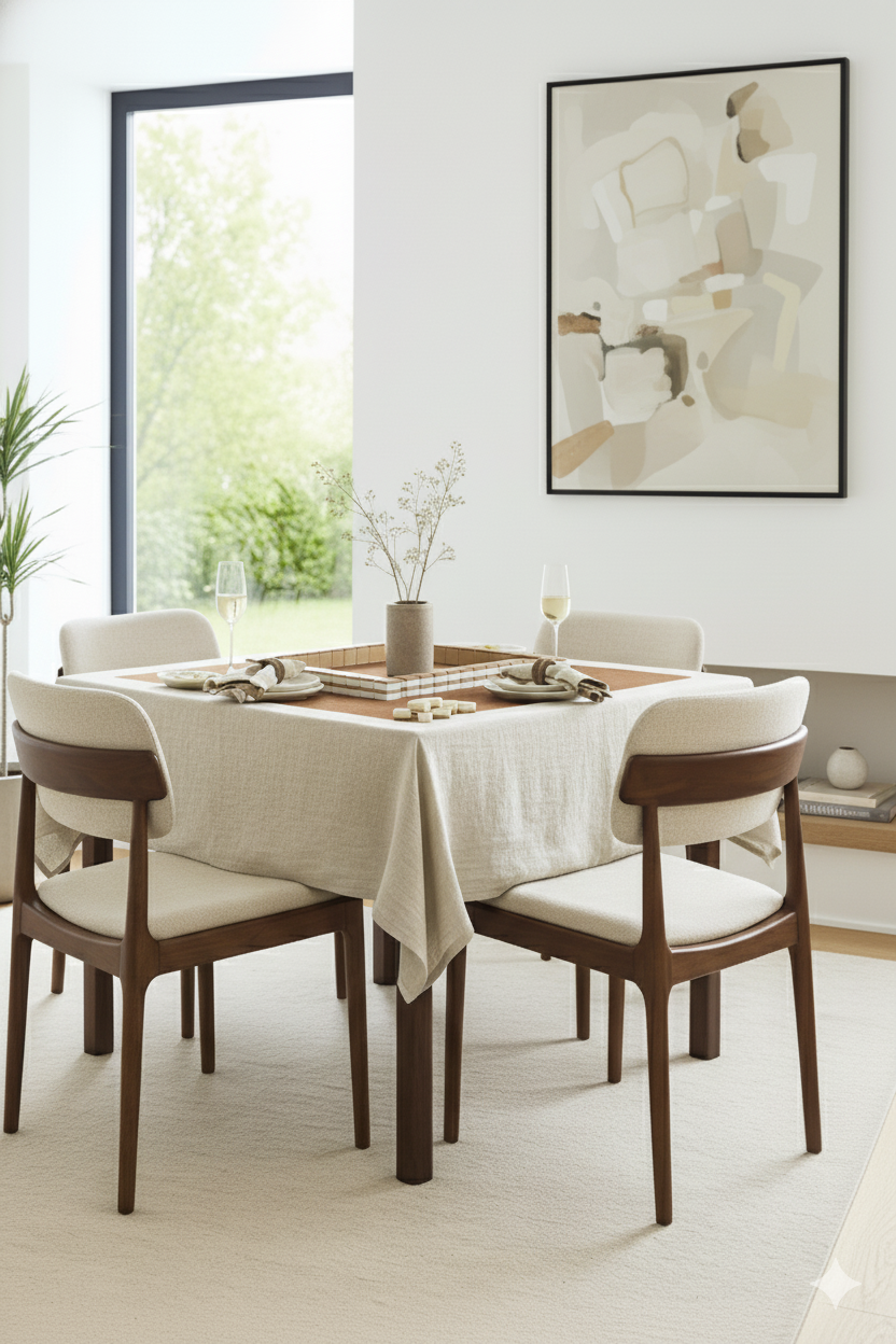 Choose a linen or textured cotton table cover in a neutral shade, then layer in small accents: a stoneware candle, a single ceramic vase, a matte-finish tray. Lighting should be warm and low, closer to a winter evening glow than a party spotlight.